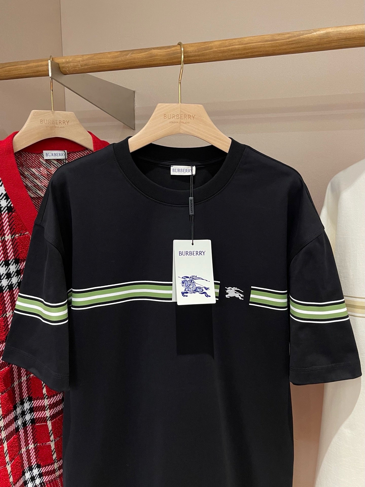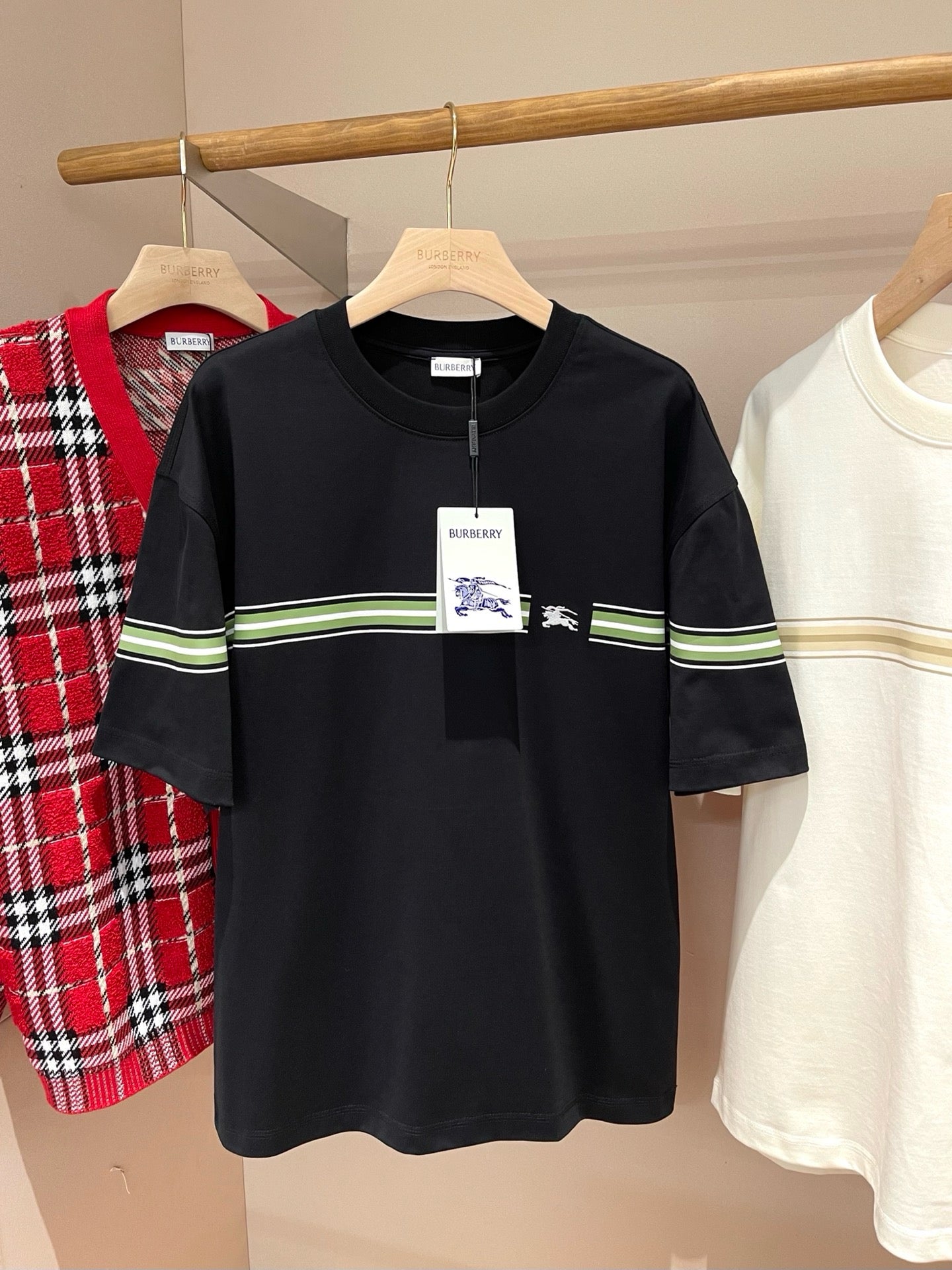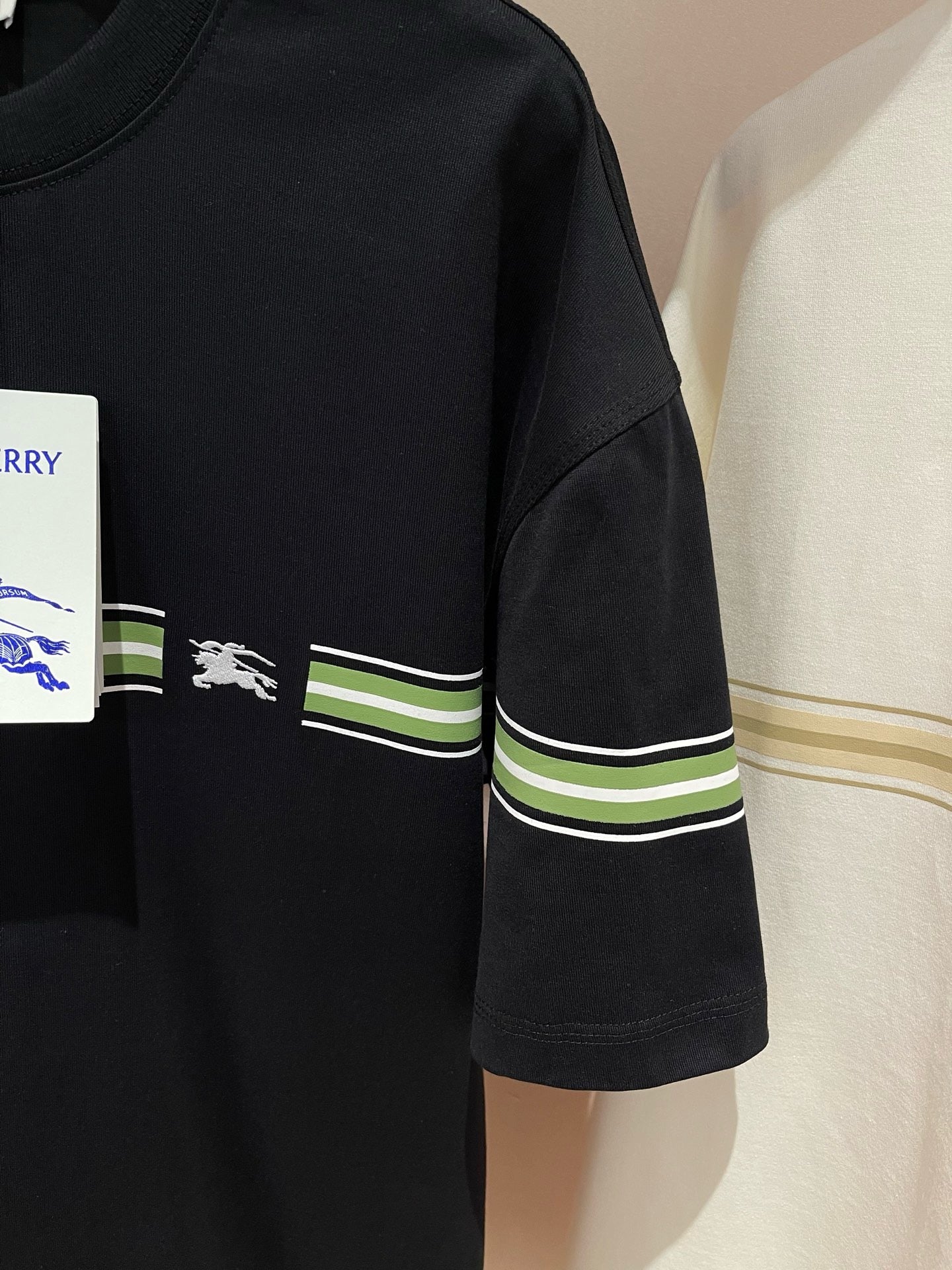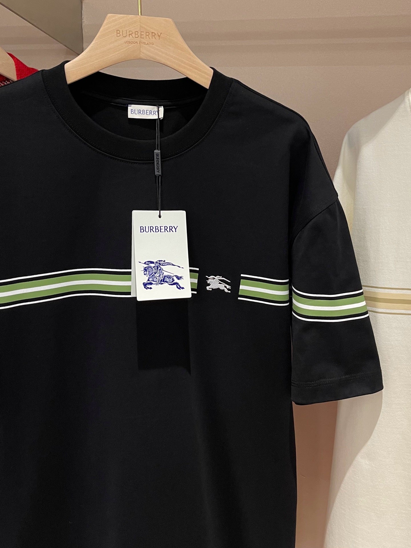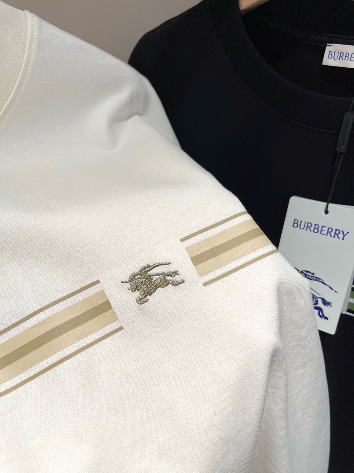 Erleben Sie die schlichte Eleganz unseres schwarz-weißen Burberry-T-Shirts. Hergestellt aus hochwertigen Materialien, ist dieses T-Shirt perfekt für jeden lässigen Look. Verleihen Sie Ihrer Garderobe mit diesem zeitlosen Stück einen Hauch von Luxus.