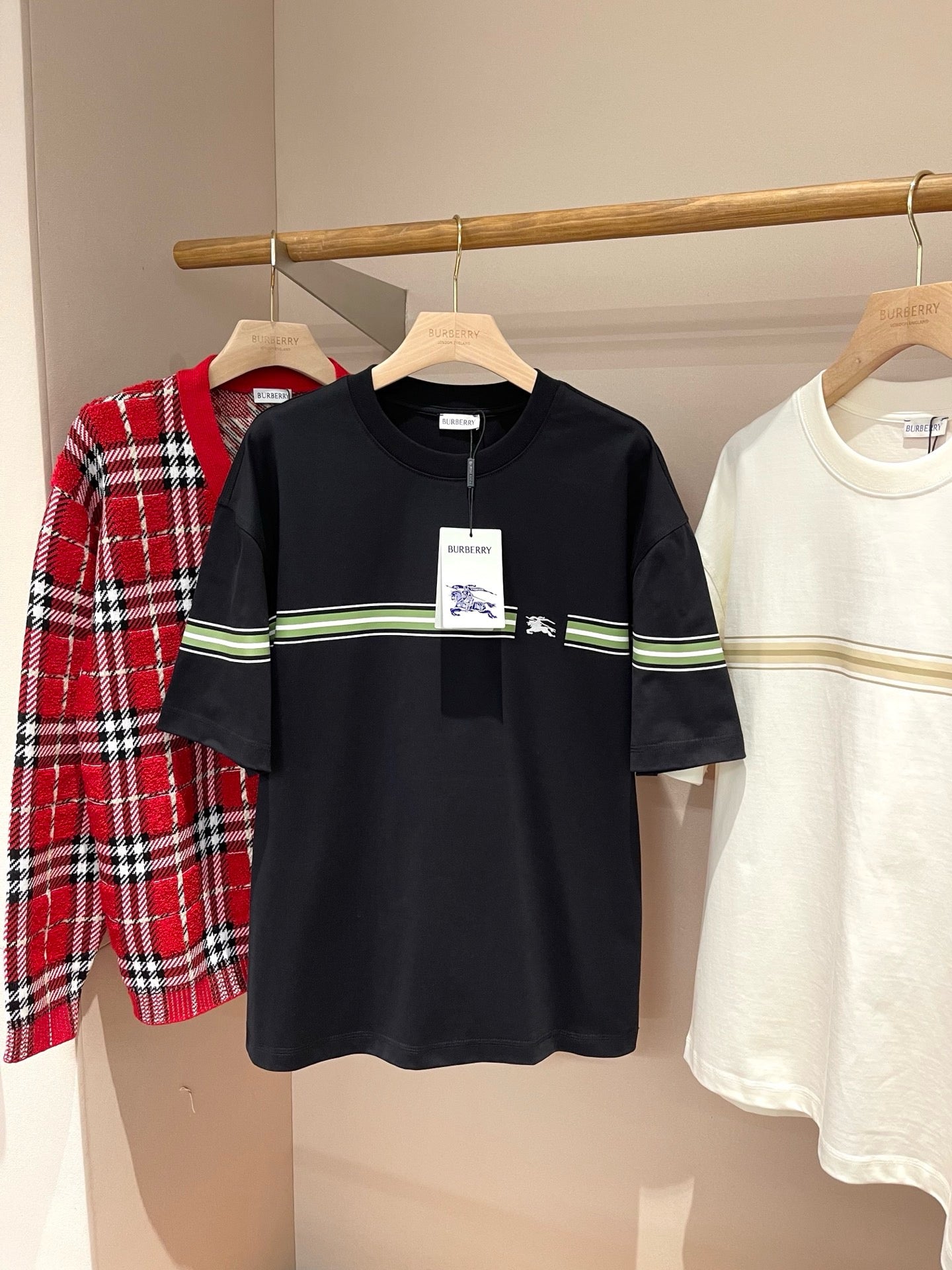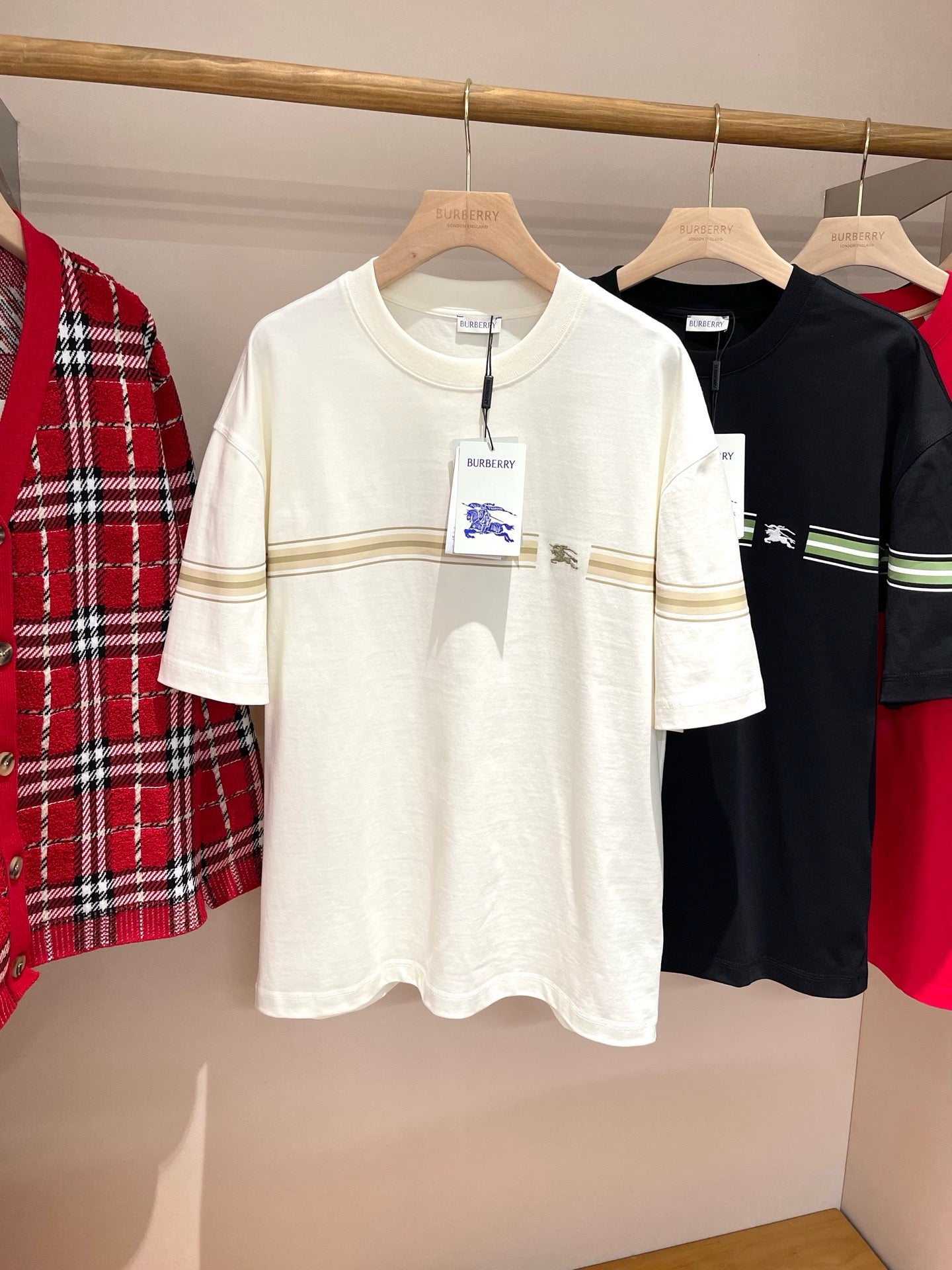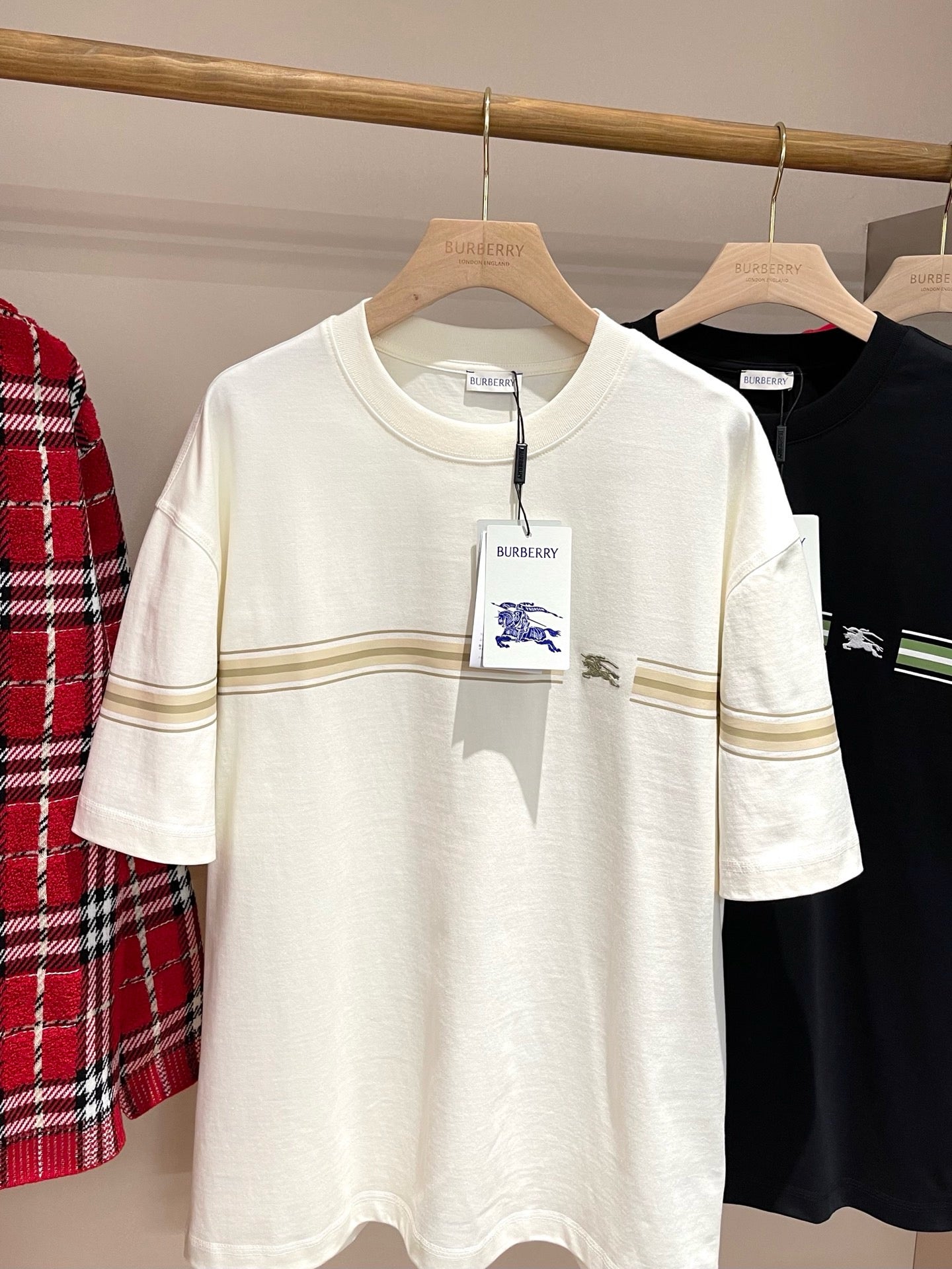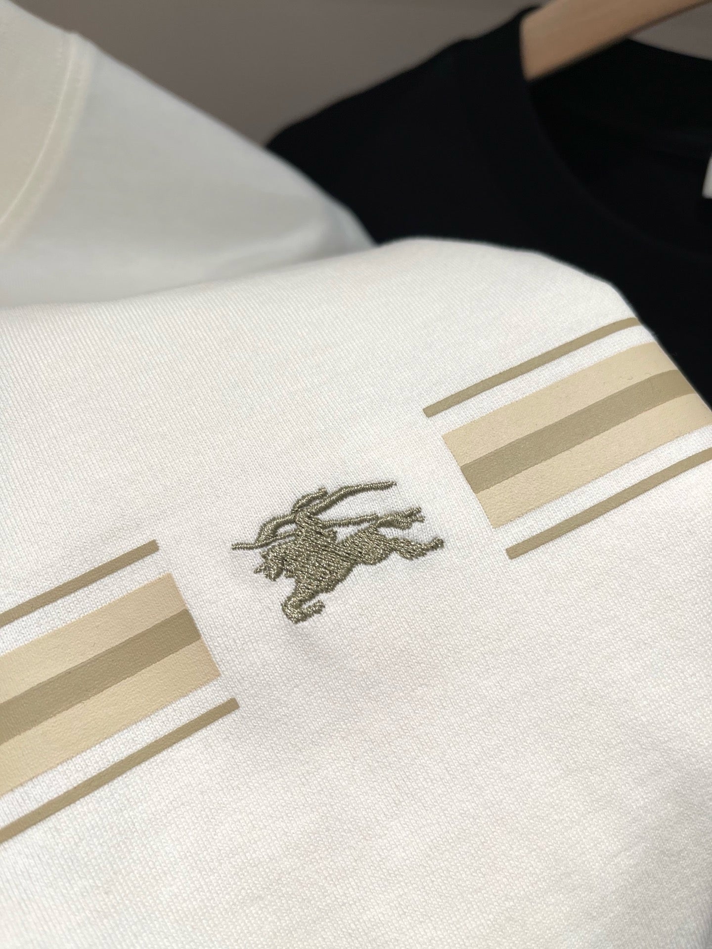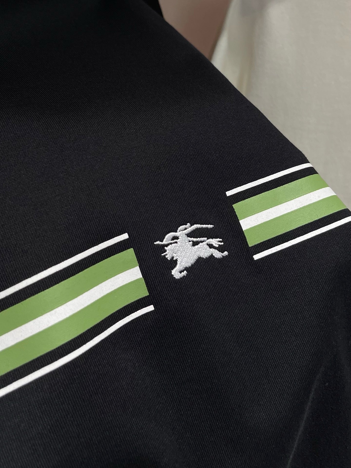 Erleben Sie die schlichte Eleganz unseres schwarz-weißen Burberry-T-Shirts. Hergestellt aus hochwertigen Materialien, ist dieses T-Shirt perfekt für jeden lässigen Look. Verleihen Sie Ihrer Garderobe mit diesem zeitlosen Stück einen Hauch von Luxus.