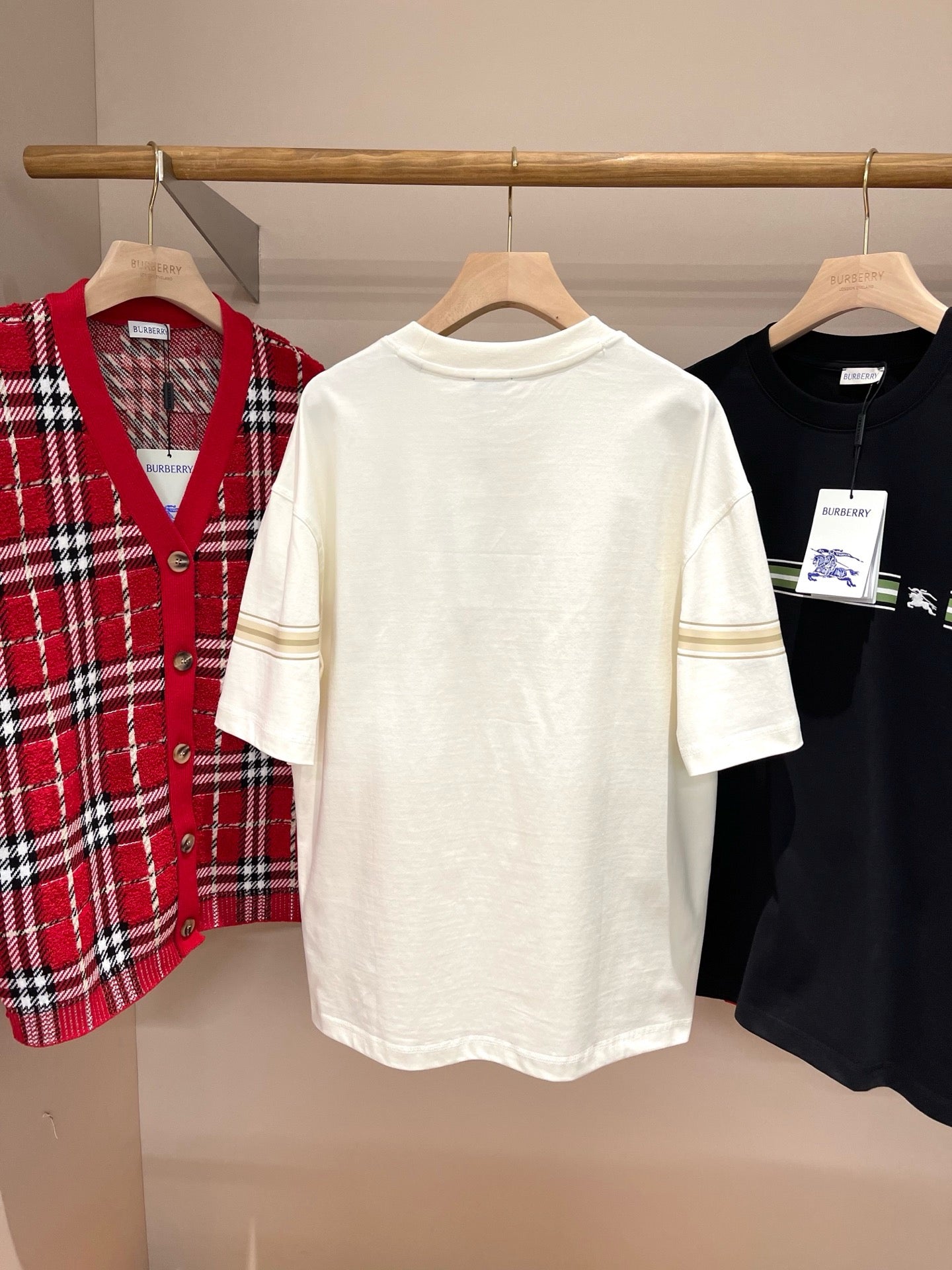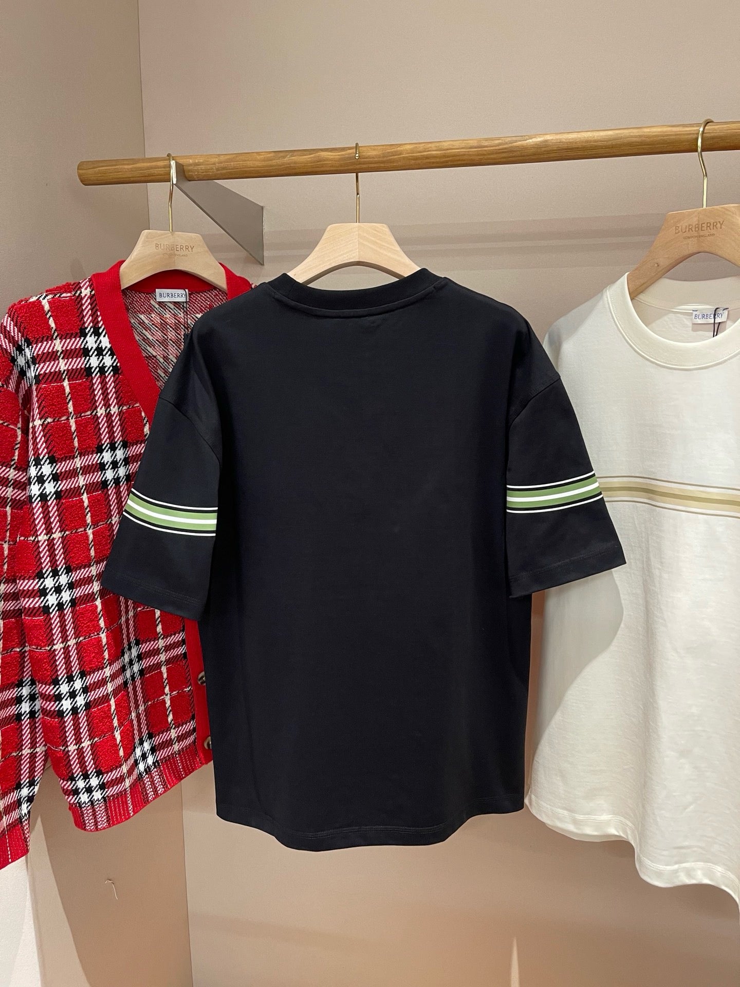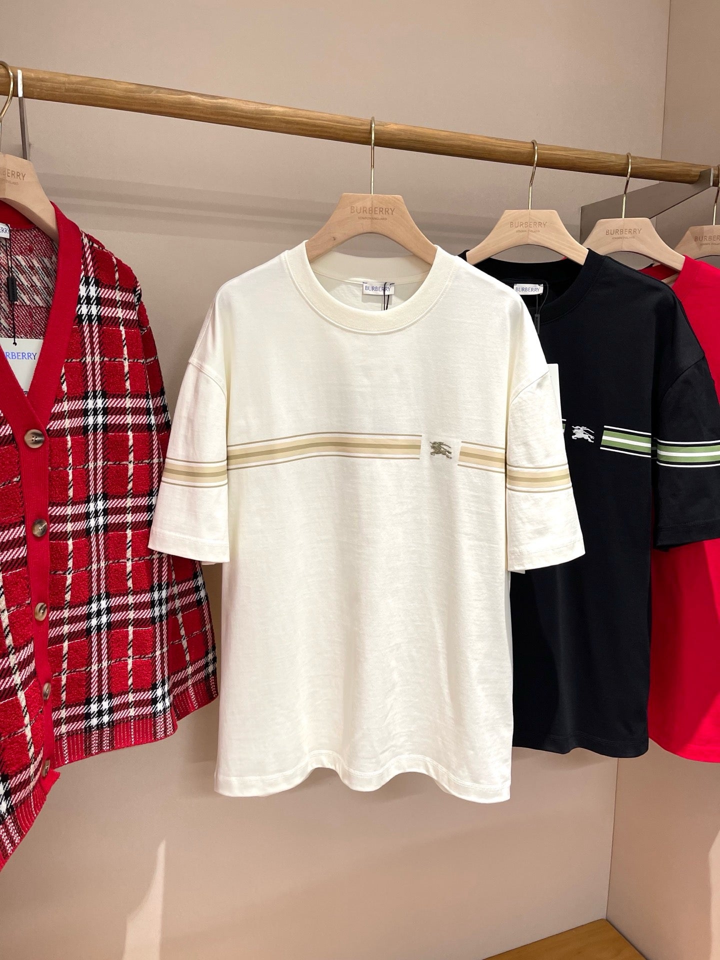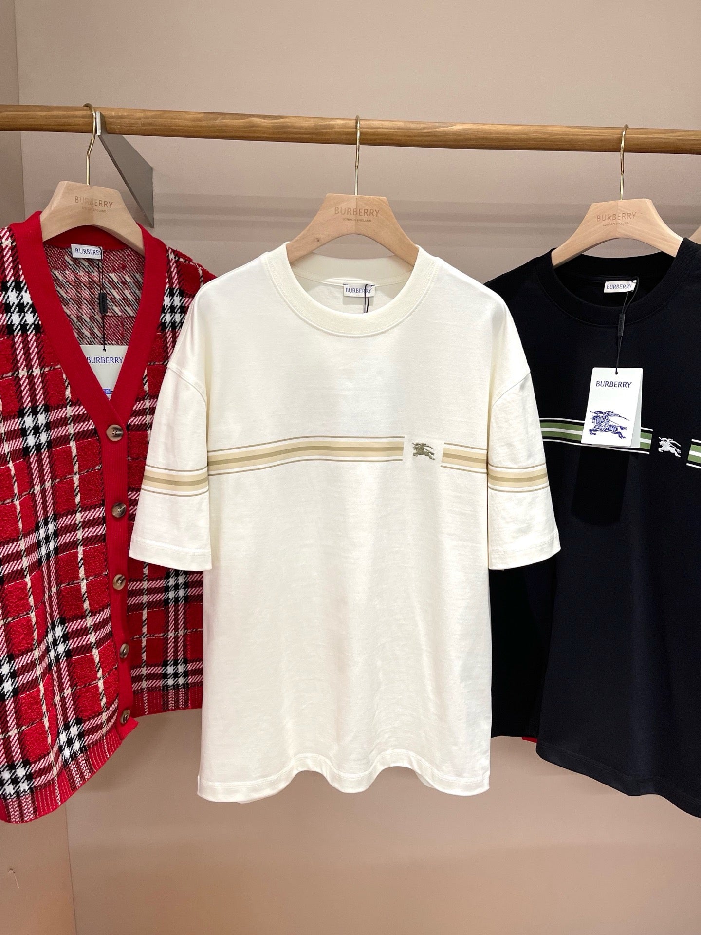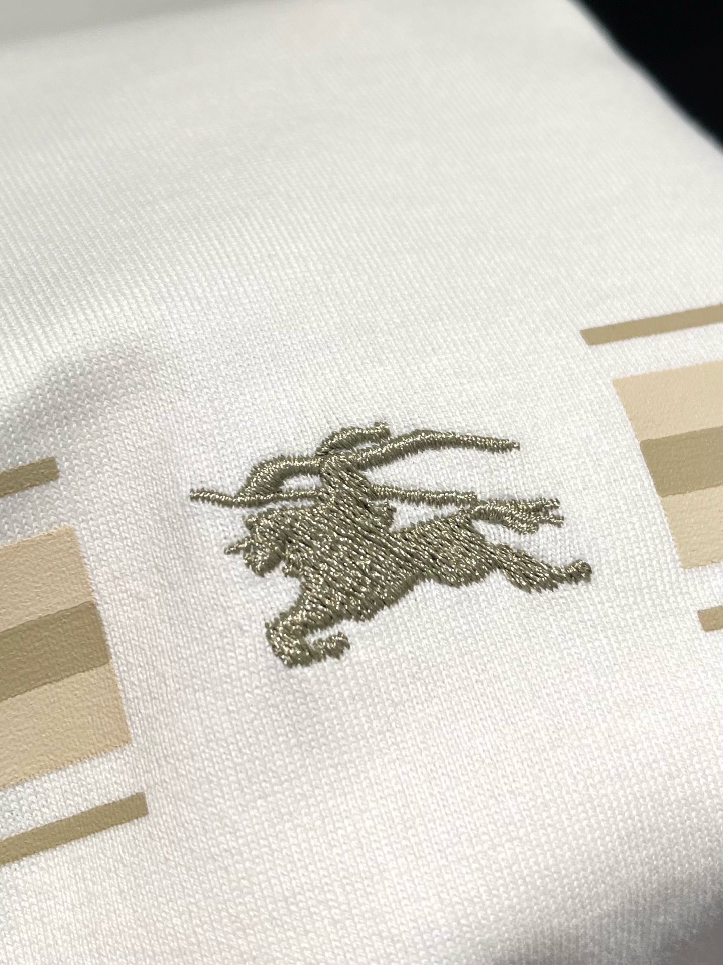 Erleben Sie die schlichte Eleganz unseres schwarz-weißen Burberry-T-Shirts. Hergestellt aus hochwertigen Materialien, ist dieses T-Shirt perfekt für jeden lässigen Look. Verleihen Sie Ihrer Garderobe mit diesem zeitlosen Stück einen Hauch von Luxus.
